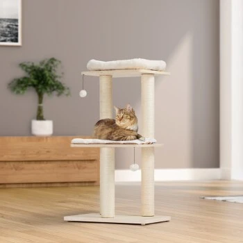 Alle Katzen haben ein natürliches Kratzbedürfnis und brauchen einen Ort für ihre Krallenpflege. Damit sich Ihre Katze gar nicht erst daran gewöhnt, ihre Krallen an Ihrem Mobiliar zu wetzen, bieten Sie ihr den AniOne Kratzbaum Lilly im modernen Holzdesign als perfekte Alternative. An den fünf Sisalstämmen kann ausgiebig gekratzt werden und Ihre Einrichtung bleibt vor Kratzspuren verschont. Die zwei Plüschbälle an elastischen Seilen sorgen für zusätzlichen Spielspaß. Der Kratzbaum von AniOne ist außerdem der ideale Rückzugsort. Die zwei Plattformen laden zum langen Verweilen und Entspannen ein. Das Plüschkissen und -Bettchen sind abnehmbar.